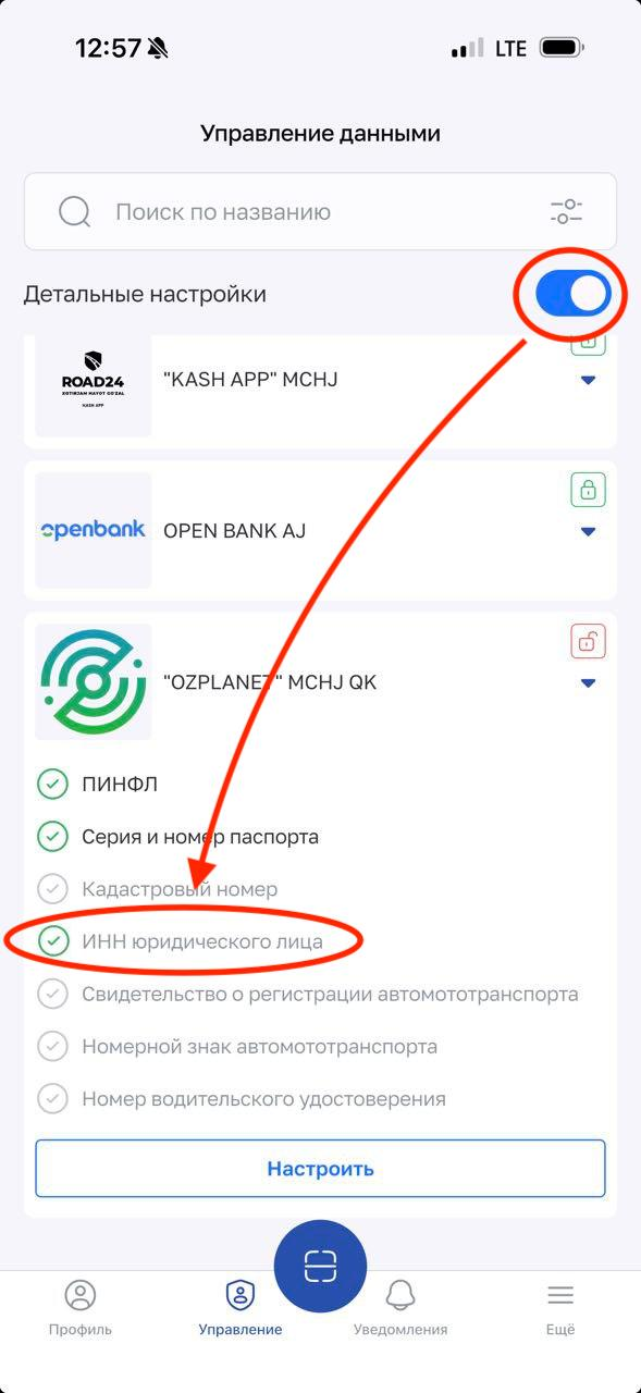 7. Дополнительные настройки покажут, какие именно доступы были открыты. Нас в первую очередь интересует, чтобы стояла зеленая галочка рядом с ИНН юридического лица